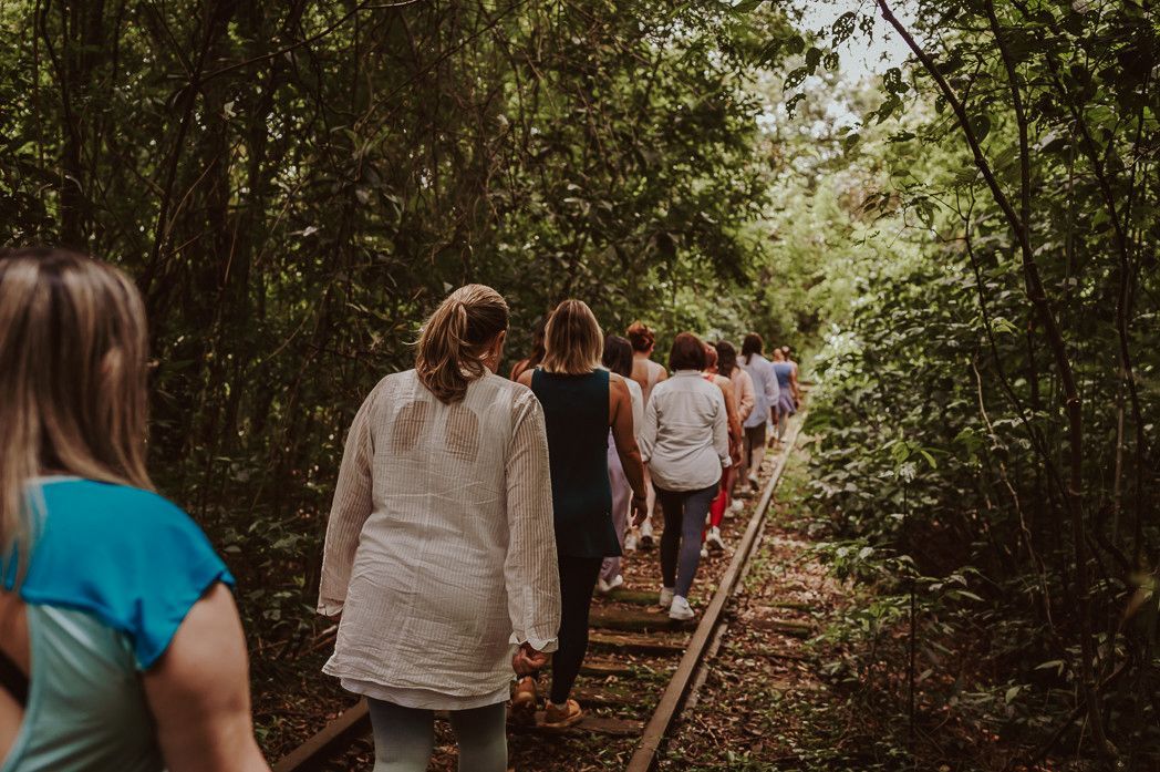 Durante a tarde, a programação incluiu uma trilha guiada pelos jardins do Taigi Garden, que levou o grupo até o túnel verde formado por antigos trilhos de trem, um dos pontos mais emblemáticos do local. O momento foi acompanhado por práticas de respiração e silêncio, promovendo contato direto com a natureza e com a própria escuta interior.
