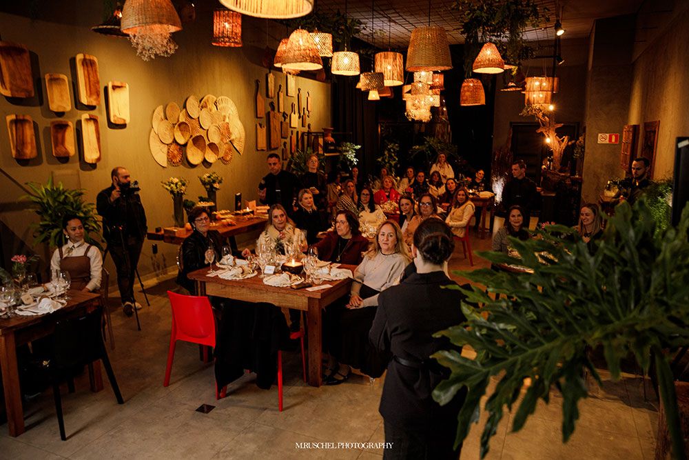 O encerramento da noite foi marcado por um jantar em formato de menu degustação, cuidadosamente harmonizado com vinhos e espumantes. Uma experiência sensorial que combinou sabor, aroma e estética de forma impecável, celebrando não apenas a gastronomia, mas também a conexão entre as convidadas.